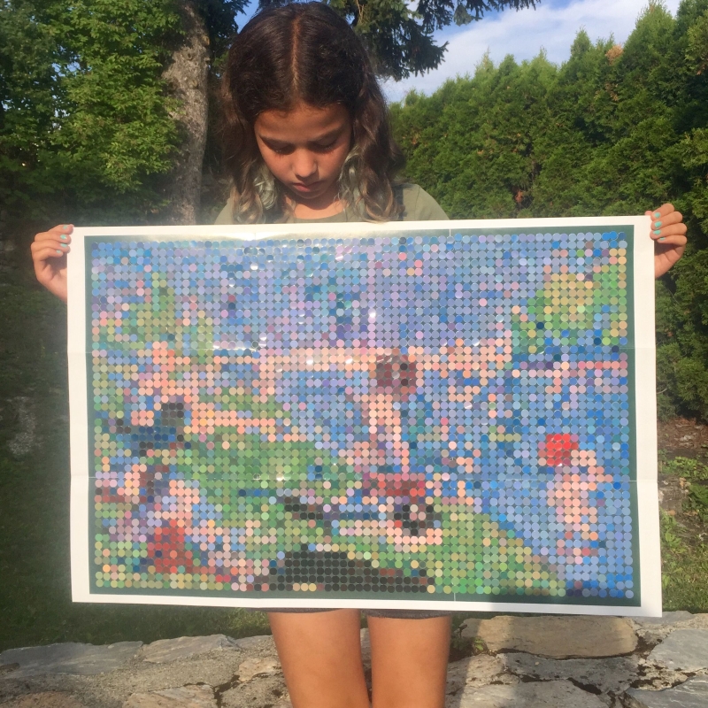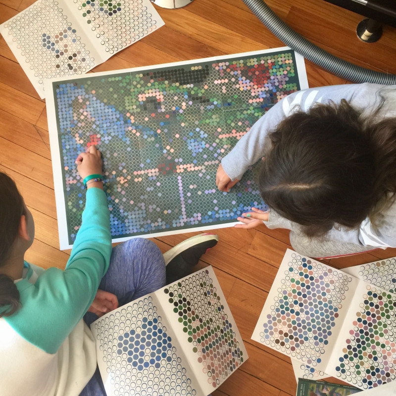 The book has a very useful design feature of a folder-style flap in the front cover so you can store everything away when you’re done and get it all out again the next time you’re ready to carry on being Seurat! This keeps everything nice and tidy, and as long as you have the space to lay the poster out, you can really do this work anywhere. What is quite reassuring is that there is no need to be exactly precise with the placement of the stickers. If you did, I think this would drive me a bit mad as I would feel the need to stick/peel/restick until each sticker was placed exactly right. This poster allows you to be imprecise but still achieve the same result. Once the poster is complete you can proudly display it on your wall! It’s amazing to watch the colours build up and gradually reveal the picture which is so famous. It’s so clever how little dots of colour can create something like this, and it really impressed me.