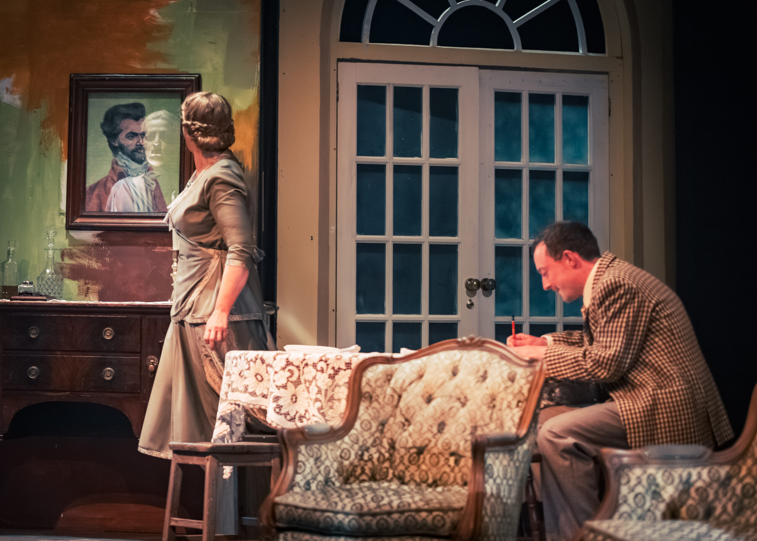 I was however really impressed by one particular aspect of the set, designed by Phil Newman, was the picture which hung on the wall. This was very clever in the ghostly faces which occasionally appeared. The rest of the set was the theatre, though it was more like a living room ‘on the stage’ but the additional aspects of the theatre such as the curtains and ornate fixtures of the frontage were excellent at creating the feeling of being in a 1930s theatre.