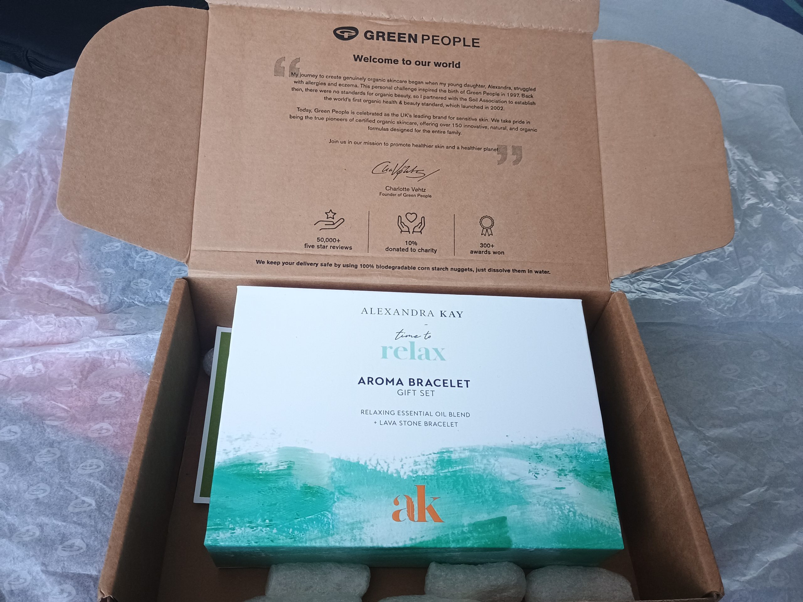 Today I received the nicest-smelling post I have ever received!! On opening the outer box, I found a Green People Organics Lifestyle, Alexandra Kay, Time to relax, Aroma bracelet.