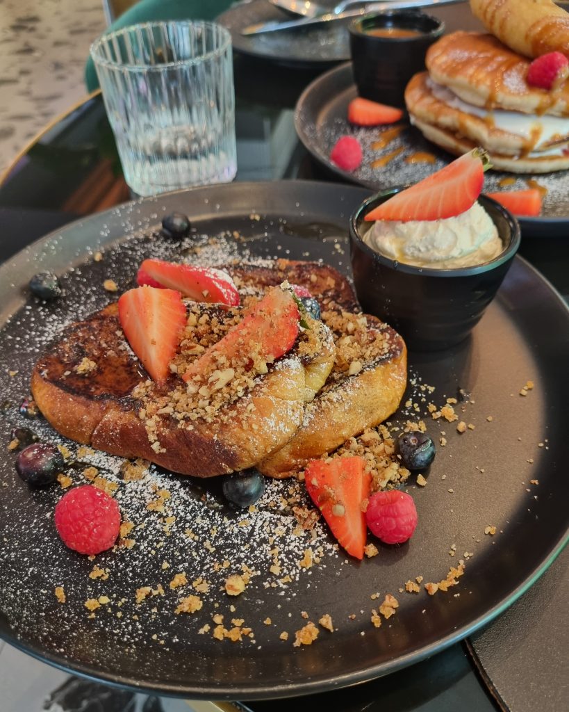 The menu only has six savoury options and two sweets, but they all looked delicious. We went for two courses which were amazing. We chose the pulled beef tacos with chipotle sauce and the chicken tenders on waffles with maple syrup which were both fabulous. For the sweet dishes we choose the golden syrup pancakes with banana fritter, berries and a butterscotch sauce and the French brioche toast with cream, pecan nut brittle. The sweet portions were huge as you will see from the pictures so you probably wouldn’t need two courses. The food was fresh, beautifully presented and had nice little unusual touches.