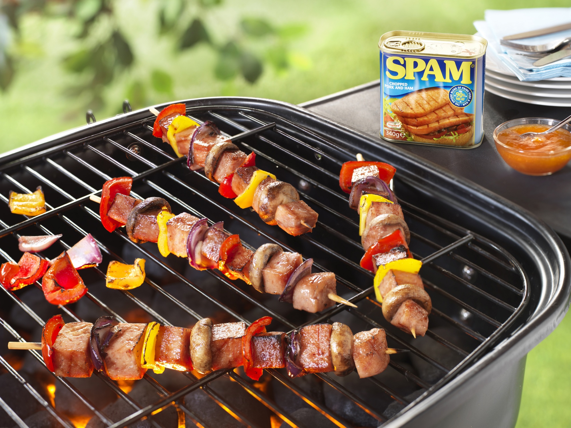 - Brush the kebabs with oil and a little Mango chutney if using and place on the hot BBQ, turning them over until all the SPAM® Chopped Pork and Ham and vegetables are nicely browned all over and cooked.