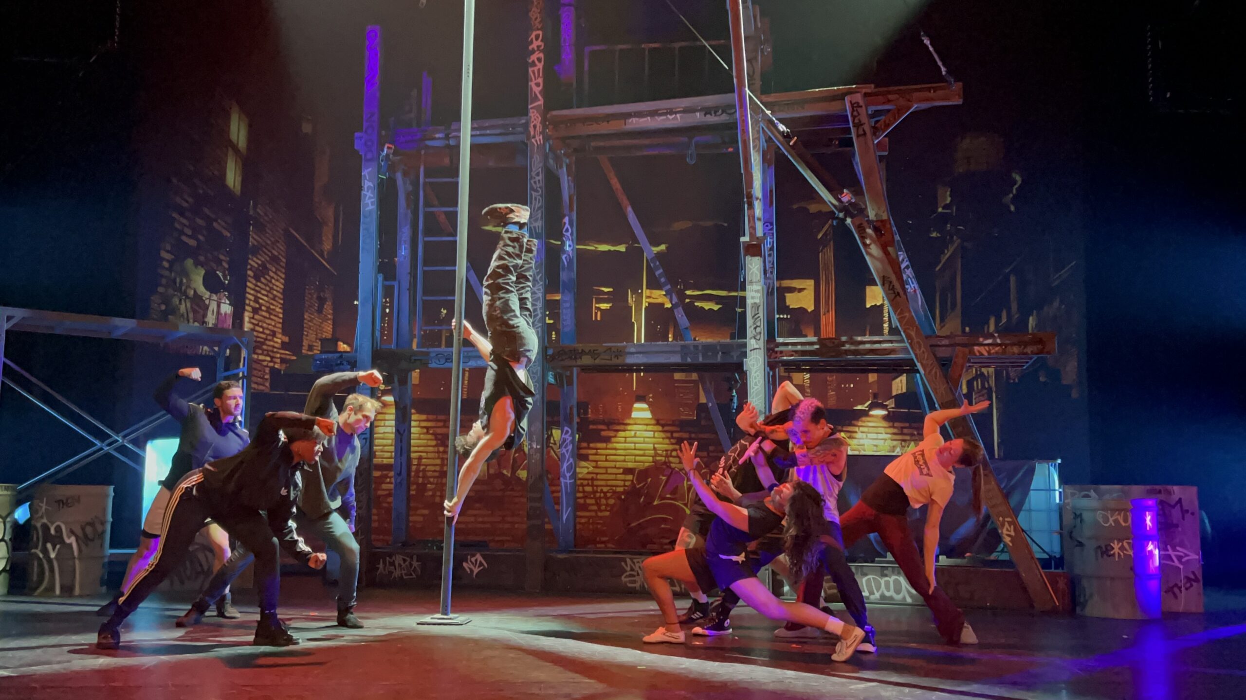 The show is set on part of a street in the middle of a busy and bustling city. This was cleverly illustrated with the help of a graffiti artist spray painting on a box in the corner of the stage and with each stroke of the spray can, a new part of the city backdrop was lit up to reveal the city. People began walking and running to and fro, to indicate the busyness of the street. Then suddenly, it all stopped and two people emerged onto the stage, one, a male dressed in blue, the other, a female dressed in orange, they meet, they gaze longingly at each other, before being interrupted by two gangs.