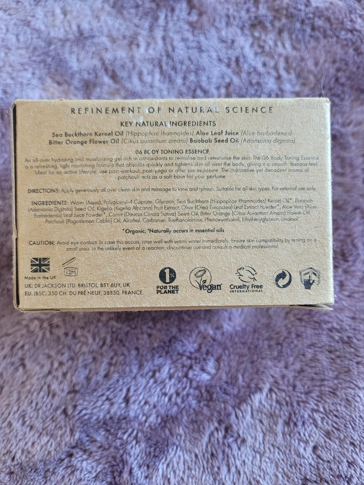 I was really excited to be asked to review Dr Jackson’s 06 Body Toning Essence. Having never used a body toning essence before, I was really looking forward to seeing what magic it could work on me! I was really impressed with the look of the product when it arrived; it was in a small brown box and looked very ‘natural’. The top of the box had ‘recycle, repurpose, reuse’ written across it, giving an indication of that Dr Jackson’s are very keen on sustainability and the environment. I was pleasantly surprised to see that the company hadn’t felt the need to wrap the box in single-use plastic, which is so often the case these days! This was a massive plus for me.