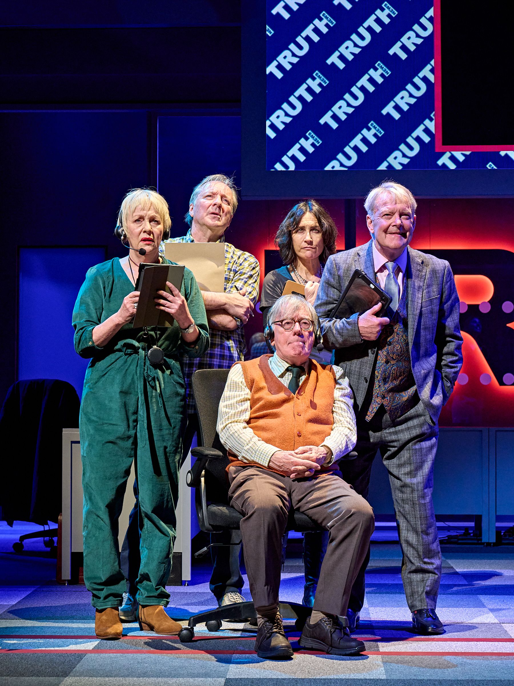 The stage is set as a newsroom with a large screen above, iPad on the desks and there is also a mini prop of gender-neutral toilets for the cast to have more intimate chats in. Times have certainly changed in the last 30 years regarding technology, inclusivity, social media and fake news. It is refreshing to see this irreverent observation brought back to life!