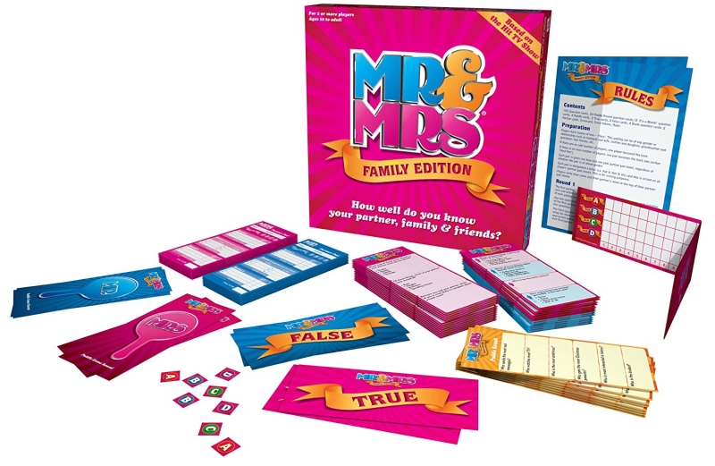 The ‘Mr & Mrs Family Edition‘ game (RRP: £17.99) contains: 100 question cards, 20 paddle round question cards, 12 it’s a match question cards, 4 paddle cards, 2 true cards, 2 false cards, 4 blank question cards, 2 partner pads, score cards and score tokens. And you need a pen or pencil.