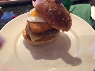 My meal, the Stateside stacker, consisted of freshly baked rosemary bread filled with double hash brown, cheese, sausage patty, fried egg and tomato ketchup. The bread was quite a heavy dough (as in felt weighty when you picked it up), however it tasted lovely and the consistency was not at all dense. I loved the sausage patty and although I am more of a brown sauce fan at breakfast the sweetness of the ketchup really completed the dish. I would recommend this dish and certainly have it again.