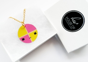 The Happy Battenberg (you can call him Mr B. for short) pendant is very cute and has a fun feel to it. The pendant measures approx. 2cm and the chain is very light and sparkly. I was concerned that it would break easily but it has proven to be strong. Both my daughters (5 and 7) have worn it, and they like to play with their necklaces. Personally I like my necklaces to have a heavier chain, but this is perfect for my girls. I do love cake themed jewellery but to be honest probably wouldn’t wear it myself.