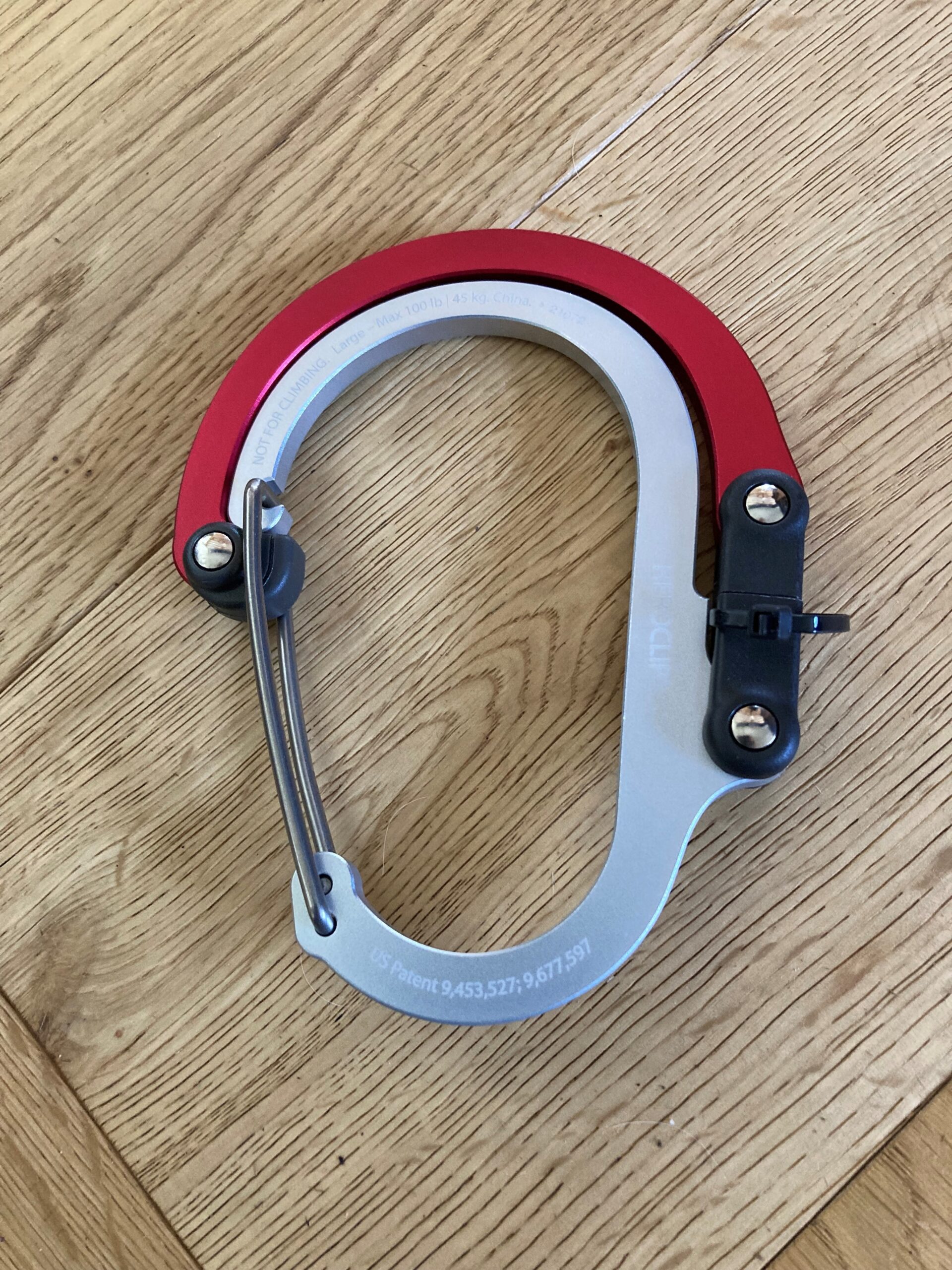 When the package arrived, it was surprisingly lightweight for a heavy-duty product, but on further inspection it was partly because there isn’t any wasteful extra packaging, just the hook cable tied onto a branded carboard backing. I was sent the large size, there is also a medium, small & mini, all made from aluminium. There are several colours in each size including blue, grey & orange, my package contained the clip in “Hot Rod” red, of which the hook is red, but the clip is plain aluminium. The clip looks quite big on the backing but when removed, it folds round itself and becomes really compact & easy to store.