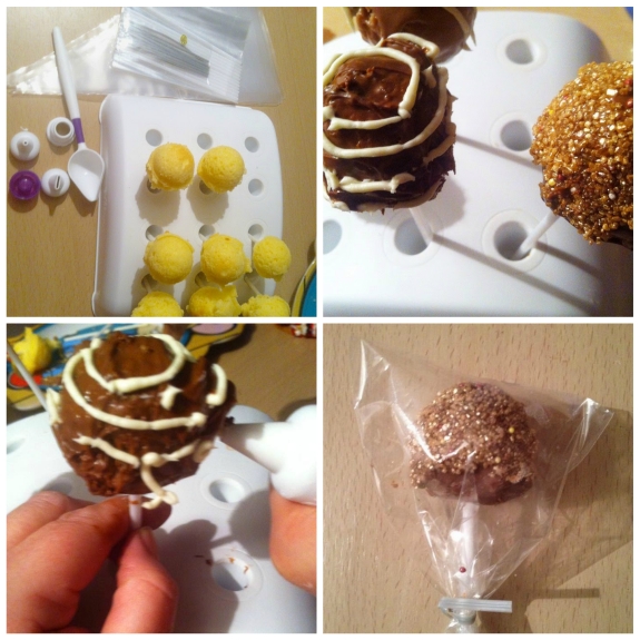 To use icing or chocolate to decorate the cake pops it’s easy. The kit comes with icing bags and tips so all you do is cut the tip off the icing bag and attach your chosen tip. Then hold the top of the bag closed and squeeze. When we were decorating the cake pops, we found it easier to have someone to rotate the stick whilst another person decorated. You don’t even need to use the piping bag that comes with the set. After you have put the melted chocolate or candy melts around your cake pop, simply dip it into a topping like sugar strands or other sweet toppings.