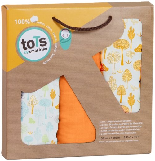I received 3 very large Bamboo Swaddle Wrap Muslins from toTs by smarTrike. The box which was very well packaged even had a cord handle on the box (perfect for a present ).