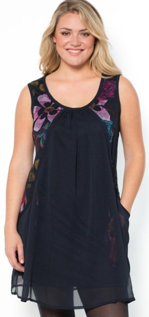 I opted for a navy and floral, 2-in-1 effect dress. A style I haven’t really seen in stores before it is sleeveless with a round neck and two layers, the underneath acting as an underskirt in plain navy. The top layer is a thin voile with a plain panel down the front which is navy, and large flower print all over the back and sides. The colours in the print are a beautiful mix of pink, purples and bright blue. I am around a size 12 to 14, but with this dress I picked a size 14 as items like this I like to wear loose. This particular dress is from the plus size range Taillissime, with sizes starting from 14 and ranging up to 32, which I think is fantastic. Having never purchased from La Redoute before I was interested to see how the fit would be, and was excited to receive my item.