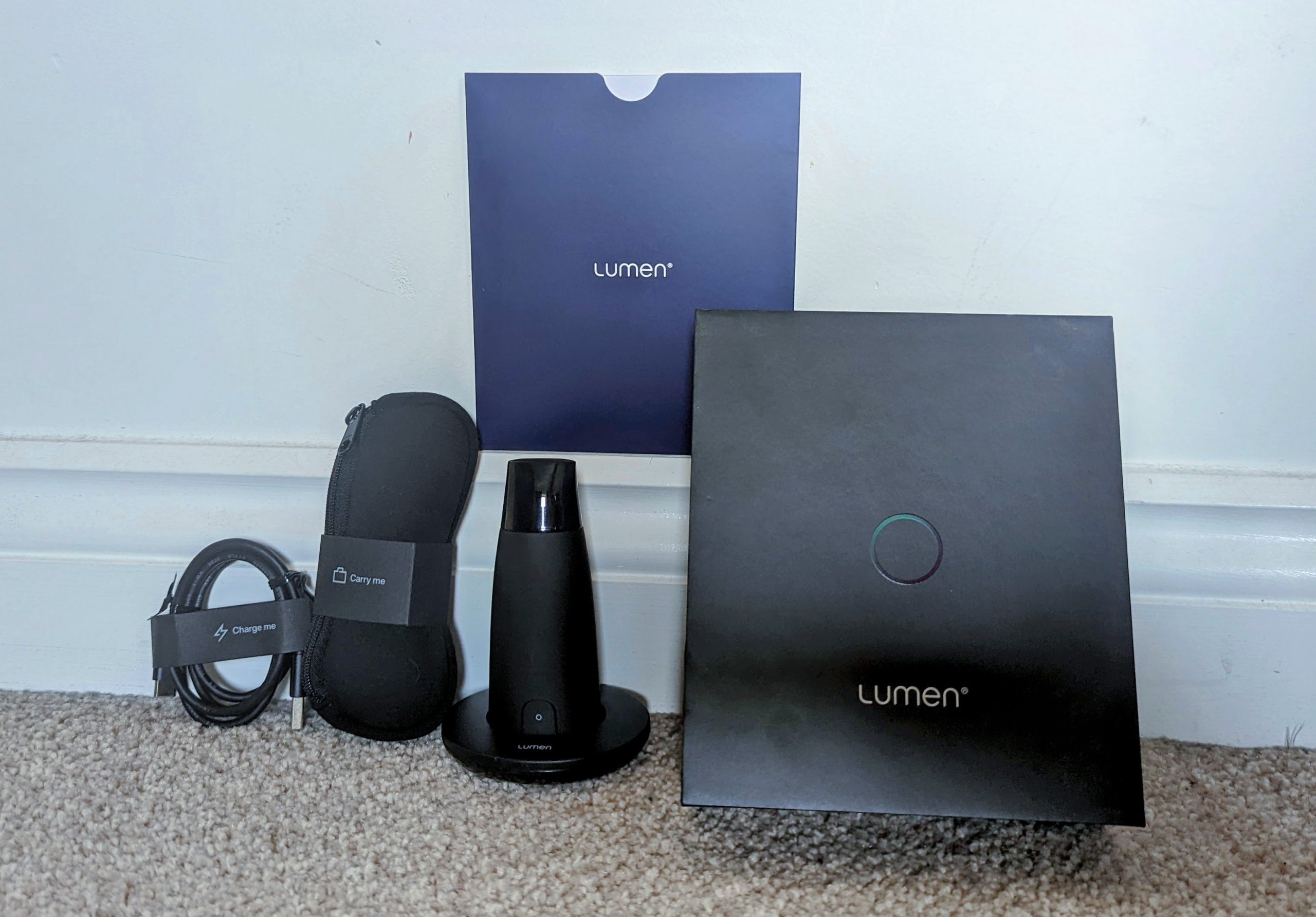 Inside the box when you open the lid you first see the Lumen device, taking this out and going to the next layer you find a pouch with the welcome information, quick start instructions, a little note to welcome and provide a bit more information about Lumen and further instructions and warranty information. Under this is the charger cradle, charger cable and a travel pouch.