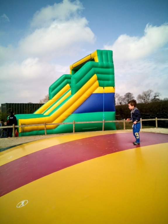 Manydown Family Fun is essentially a big open space with lots of simple, fun activities. If you have a child who likes bouncing, crawling and climbing then this is the place for you! Within the main area there is a large sandpit, a play area with climbing frames and a slide, a hill with built in tunnels and slides, an old tractor for clambering over, several swings, tyre stack, hay bales stack and lots of mini tractor ride-ons. My 4 year old immediately made a beeline for the bouncy pillow (awesome fun!) which also has near to it a bouncy castle and large inflatable slide. Continuing the bouncy theme he then headed for the trampolines. These are great as they are set into the ground and age segregated, making them really safe for all ages.