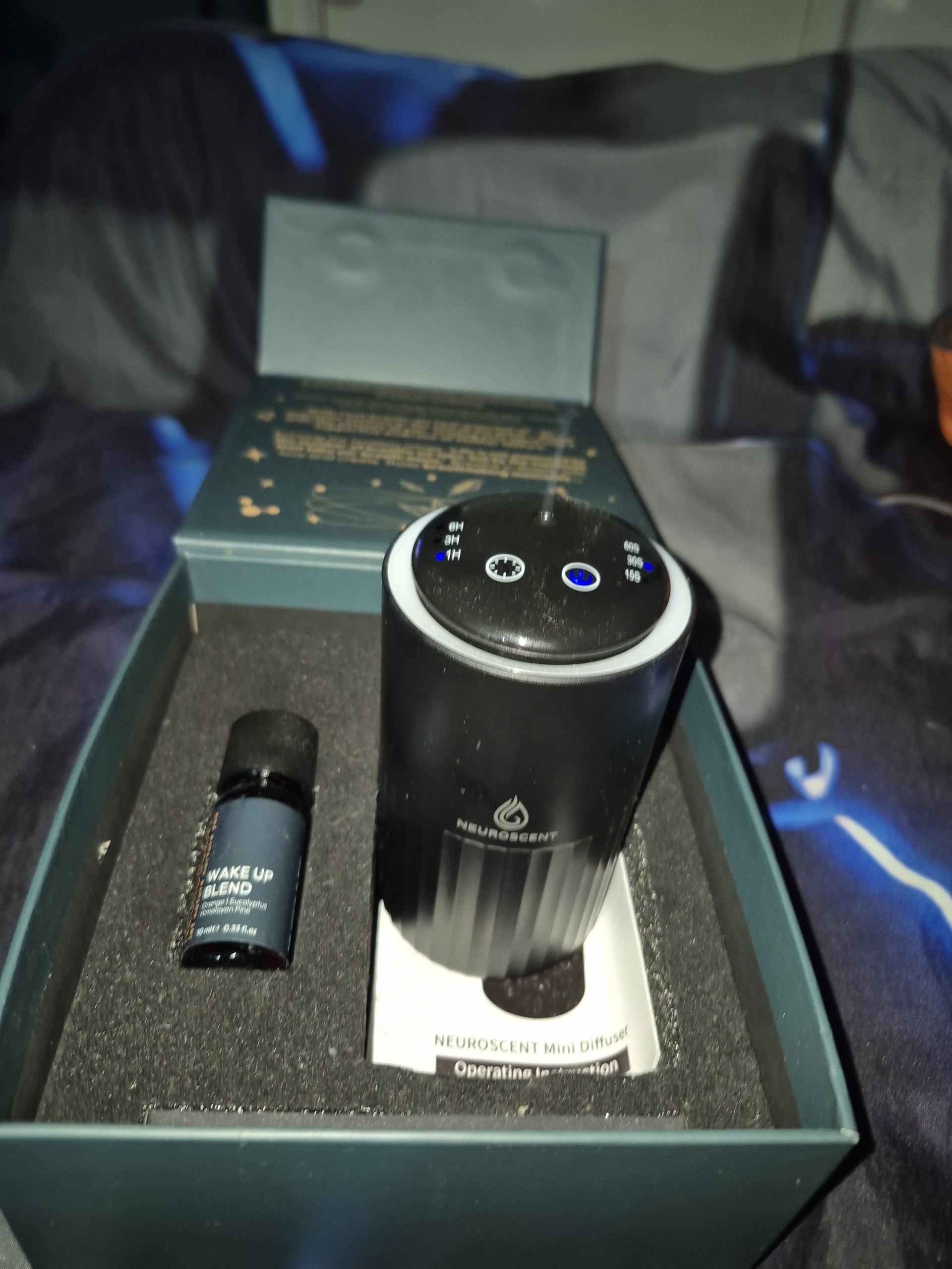 I was absolutely thrilled to have the opportunity to review this NeuroScent Portable Diffuser as someone in my life had been looking for one.  They purchased a different diffuser at first elsewhere, but I felt that this one would be much better for them.  I was right.   The product arrived in perfect condition.  The packaging looked simple but stunning.   The diffuser itself looks to have been made from quality materials and is easy to operate. I think that it is the perfect size, not too small or too big.  It looks great when set up in a room. We also received 2 x 10ml bottles of natural essential oils, one of which was the wake up blend, which I think will last a good while.