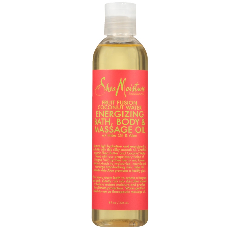The first item we received as a Shea Moisture Fruit Fusion Coconut Water Energizing Bath, Body & Massage Oil (RRP: £11.99). This product comes in a 237ml clear bottle with a simple red and pink label. I was amazed to find out from the label that Shea Moisture was established over 100 years ago back in 1912. The label pointed out that the product contains Imbe Oil and Aloe and is meant for dry, dull skin. Dry skin is an issue that both myself and my daughter get from time to time. It can be hard to manage. One hesitation I have is that I can find the smell of coconuts overpowering. I need not have worried as the scent of this massage oil is delightful. Looking at the ingredients I am not surprised about this. As well as containing the ingredients I have already mentioned, the product also contains certified organic shea butter, dragon fruit, lychee berry and green apple. Shea Moisture appear to have found the perfect combination of ingredients to nourish, moisturise and recharge our skin.