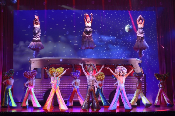Each scene is full of high energy songs and the characters are joined by an array of cast members in vivacious and  flamboyant costumes delivering disco classics like ‘Go West’,  ‘Hot Stuff’, ‘Girls Just Wanna Have Fun’ and  ‘I Will Survive’ to name a few . The three divas hovering above the stage bellow out the tunes with their powerful voices. Flamboyant and fabulous is what this show has to offer there are plenty of hits that will have you singing along!!