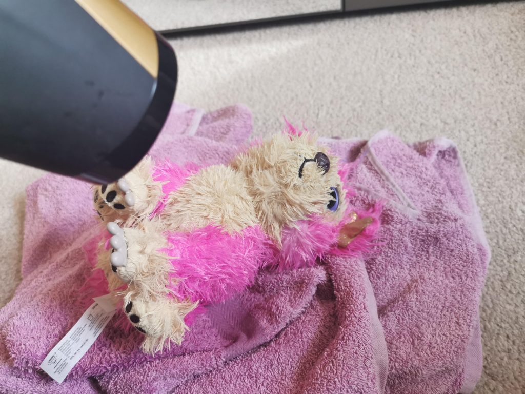 Taking the puppy out of the kennel you see just why you need the clippers, the dog needs all of the pink fluff ‘shaved’ off, to reveal the bedraggled puppy lurking beneath. The fluff when off goes into the empty cushion cover to stuff it. This cushion would be better with a slightly better closing than just velcro as I just know I am going to end up with Pinky Sparkles fluff all around the house. Once de fluffed, your new pet needs a bath, then drying – suggested with a hairdryer – at this point, be prepared to be blow drying your child’s new pal for longer than you have spent on your own hair for the last 12 months put together! I can guarantee if your little one is anything like mine they will not sit and dry their pet for longer than a few minutes, leaving that fun to you.