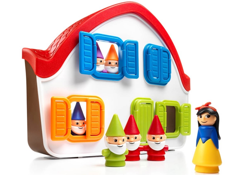 Contained in the box is a plastic house with colour coded closable shutter windows, a SnowWhite playing piece, 7 colour coded dwarfs (two sets of twins and three singletons), an Evil Queen playing piece, a challenge book containing the puzzles, a Snow White picture book and a set of instructions. On initial inspection, my first impression was that everything in the box was very high quality. The house is substantial, the shutters opened and closed without appearing loose and all the playing pieces are well made and solid.