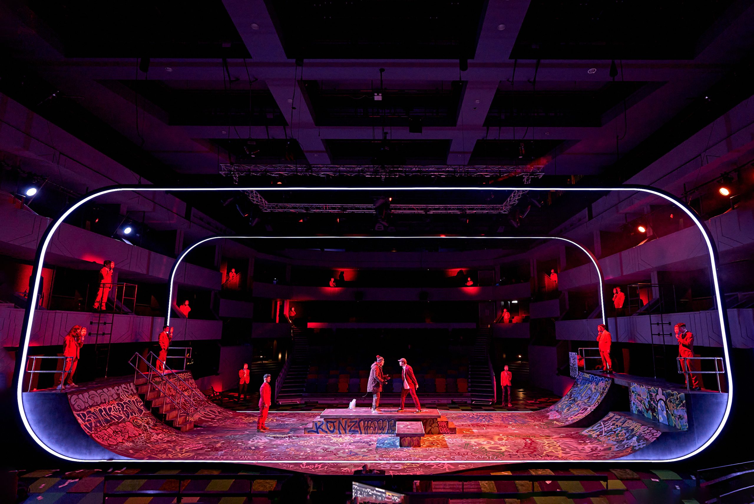 The staging for this production is just amazing. As I walked into the auditorium, I was taken aback and impressed. Radland skatepark had authentically been recreated in the middle of the theatre and the seating was all around it, making it a much more intimate and immersive feeling. This staging and seating made you feel like you were a part of the bubble. I have never been to a play where I didn’t feel like I was watching a play, but experiencing it first hand instead and it was a brilliant experience and one I would happily go and see again.