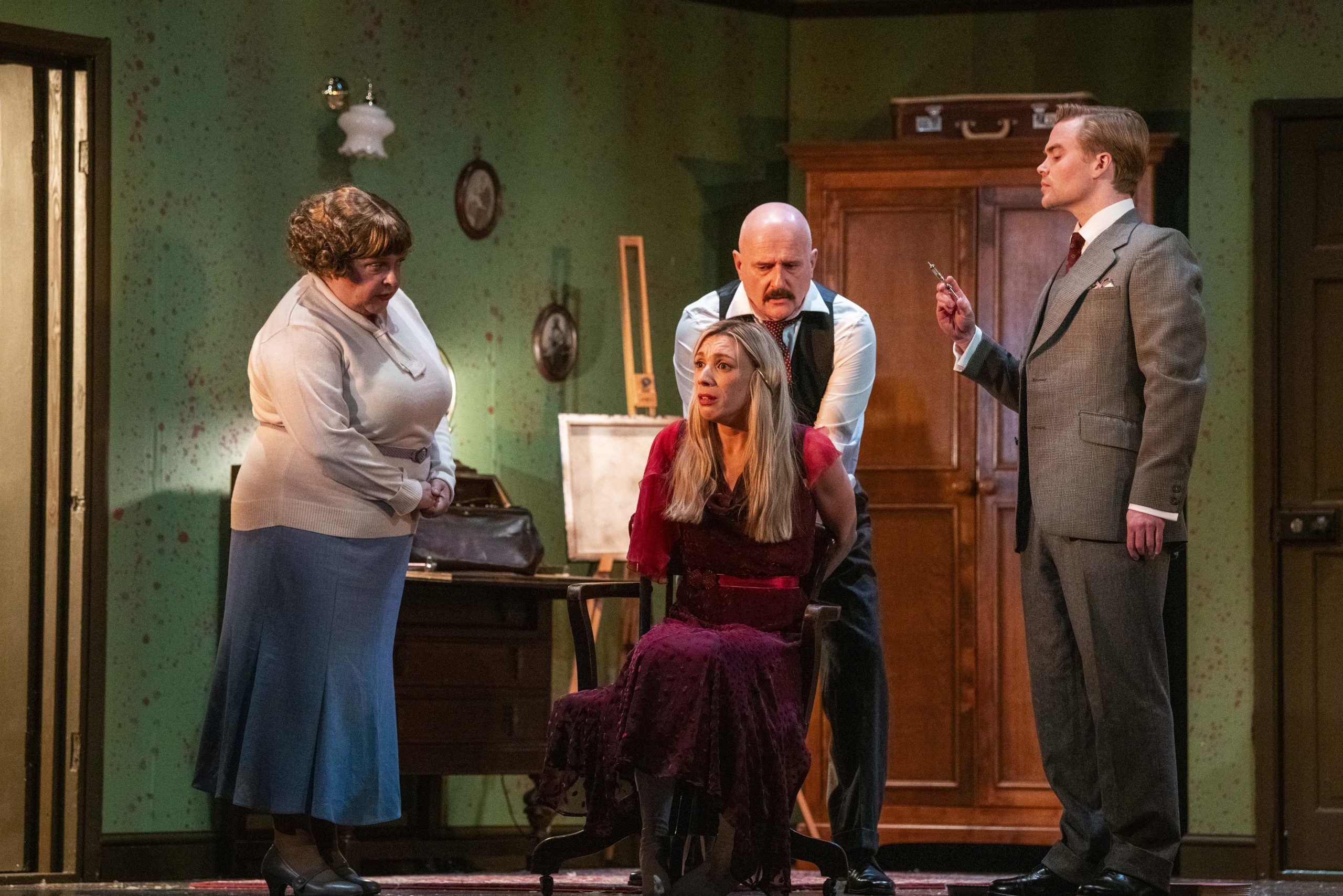 Less well known than some of Levin’s other productions, Veronica’s Room shares his same knack of blending suspense with horror. Set in Boston, USA in 1973, the stage is set as a bedroom, with the furniture covered with dustcloths to preserve it. We are introduced to the McKays, played by Susan Earnshaw and Jeremy Lloyd Thomas, who say they are carers for Sissy, the owner of the Brabisant mansion where they live. The room belonged to Veronica, who died of TB when she was younger.