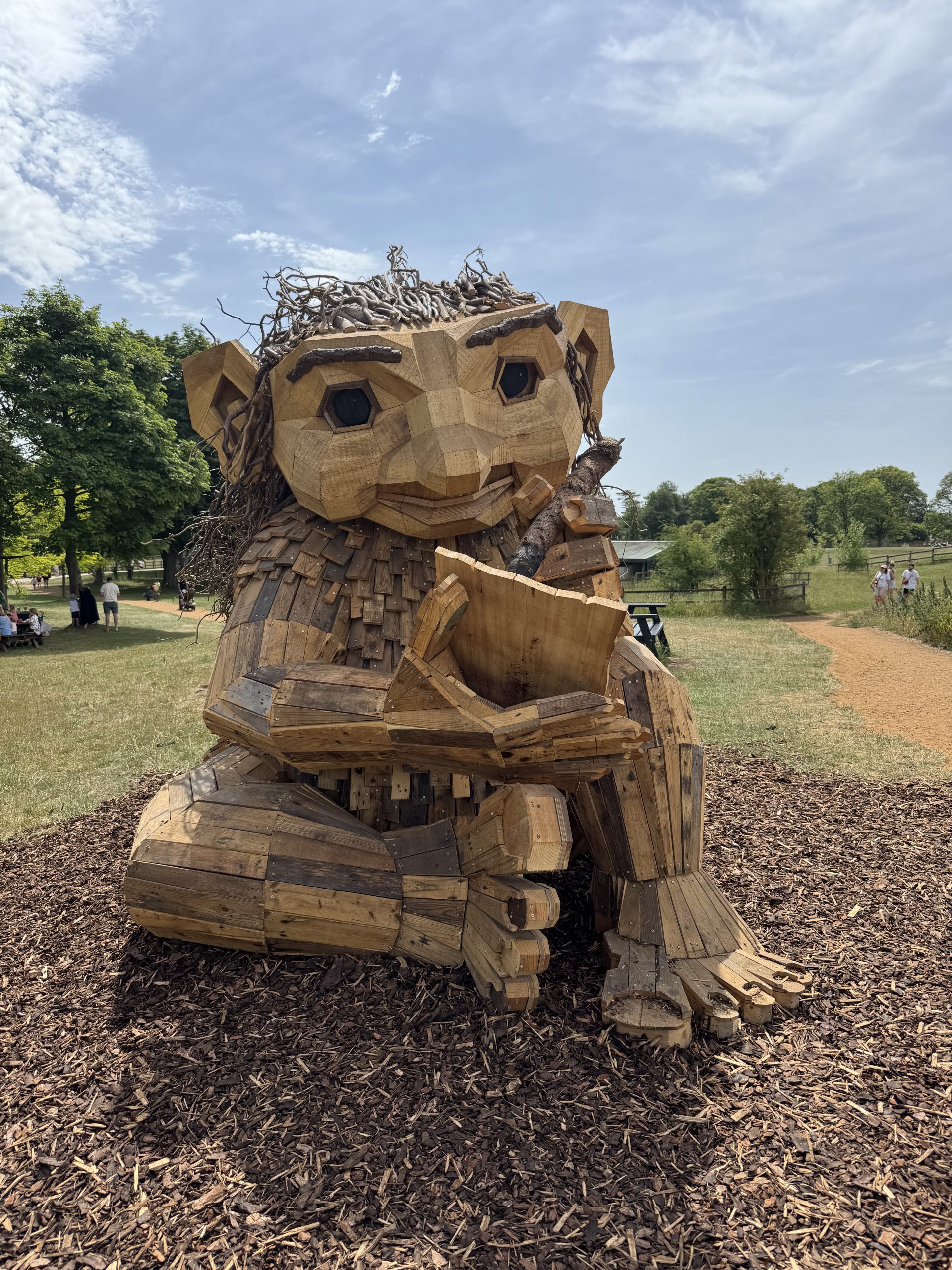 On Saturday 21 June (not only solstice day but one of the hottest of the year!) we were invited to visit and experience the brand new Trolls: A Field Study at Whipsnade Zoo. This attraction is running within the zoo from the 21 June to the 22 September, there are 12 wonderful trolls across the zoo all made from the likes of twigs, fallen branches and wooden pallets by the Danish artist Thomas Dambo. I have to say they really have to be seen to appreciate them fully, they are magnificent.
