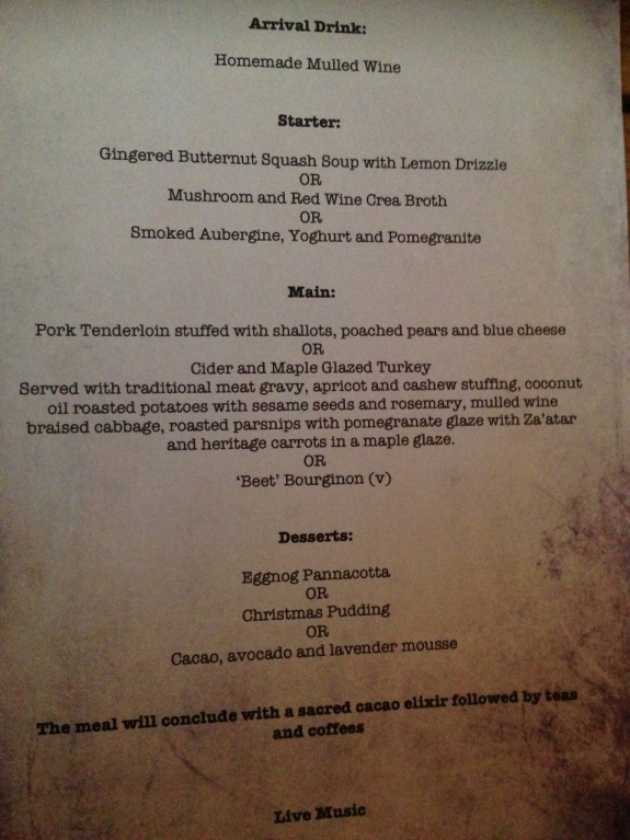 All in all The Yard appears to be really well run (it’s a family affair, with Mum, Dad, Sadie and her brother Simon working very hard 7 days a week) with polite and knowledgeable friendly staff at hand. The prices are generally fixed on these theme nights – tonight’s meal was £41pp for the three courses, mulled wine, sacred cacao elixir and coffee, which is very reasonable. The food is fresh, hot and tasty. I would certainly book well in advance as this place is reported as being an up and coming popular venue – check out the forthcoming events: www.theyardalderleyedge.com/calendar.